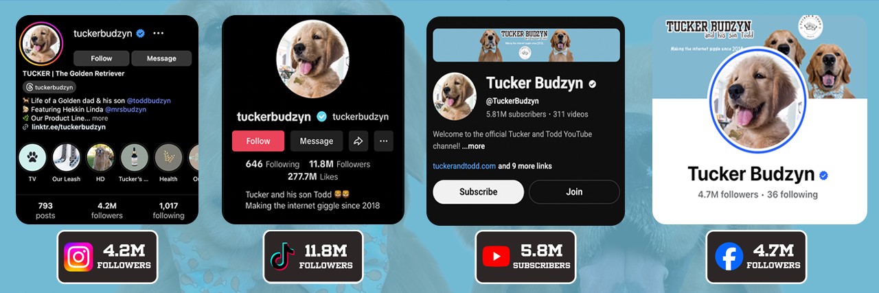 Tucker Budzyn is the most famous dog on social media, beloved for his charming personality, expressive face, and hilarious, family-friendly videos. This Golden Retriever from the U.S. has taken over platforms like YouTube (5.8M), TikTok (11.8M), and Instagram (4M) with his playful antics, food reviews, and relatable “dog-speak” skits alongside his owner, Todd. Tucker’s content is wholesome, universally funny, and instantly shareable—making him a global icon and the internet’s favorite good boy.